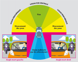 - Vers l’avant et latéralement, en prenant en compte tous les éléments constituant son environnement (mobiles, fixes ou aléatoires) qui se trouvent dans son sens de circulation